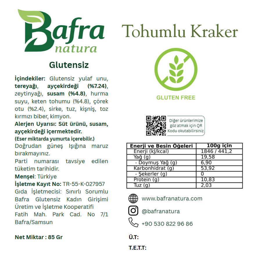 Özenle hazırlanan Glutensiz Tohum Krakerimiz, zengin tohum karışımı ve aromatik baharatlarıyla sağlıklı ve doyurucu bir atıştırmalık alternatifi sunar. Yulaf ununun doğal yapısı ile keten tohumu, ay çekirdeği, susam ve çörek otunun besleyici özellikleri bir araya gelerek lif açısından zengin ve dengeli bir kraker formu oluşturur.